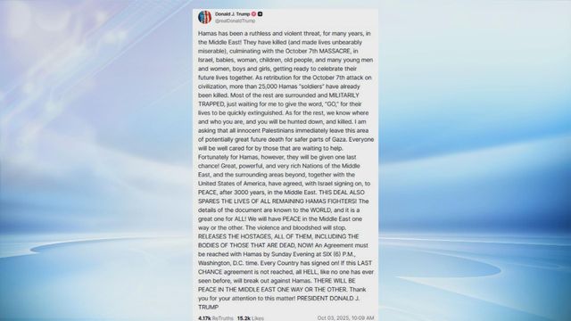巴勒斯坦武裝組織哈馬斯,回應美國總統特朗普提出的加沙和平20點方案,同意接納部分內容,包括釋放所有人質,但未有提及解除武裝。以色列總理內塔尼亞胡之後亦表示,準備立即落實第一階段加沙和平方案。美國總統特朗普周五在他的社交平台發帖文,要求巴勒斯坦武裝組織哈馬斯在東岸時間周日傍晚六時前,接納他提出的加沙和平20點方案。在特朗普發出最後通牒後不久,哈馬斯發聲明表示接納方案部分內容,包括向政治中立的巴勒斯坦機構交出權力,以及依照20點方案的方程式,釋放所有人質,但就未有提及以色列極力要求的解除武裝。特朗普本星期初跟以色列總理內塔尼亞胡會面後,提出和平方案,並稱已獲以色列支持。方案內容包括假如以哈都同意接納方案,戰爭會馬上結束,以軍會撤退至議定的防線,為釋放人質做準備。另外,當哈馬斯釋放所有人質後,同意放下武裝的組織成員,將會獲得特赦。至於加沙日後的管治,方案提出,當地將會由一個臨時過渡委員會管治,委員會以符合資格的巴勒斯坦人及國際專家組成,由一個新成立的過渡國際機構監管,特朗普擔任機構主席,哈馬斯在加沙的管治工作上不會有任何角色。美國會與阿拉伯國家及國際夥伴合作,建立臨時國際維穩部隊在加沙駐守。哈馬斯同意接納20點方案部分內容後,特朗普敦促以色列,停止轟炸加沙。加沙衞生部門統計,以色列和哈馬斯前年10月爆發衝突以來,累計死亡人數已逾6.6萬,而根據世界衞生組織於周四發表的報告,累計受傷人數逾16.7萬,其中重傷佔兩成半。