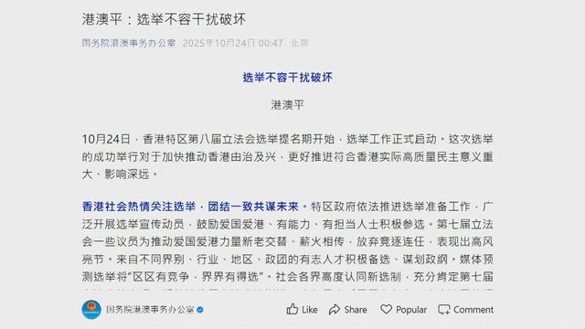 立法會選舉|港澳辦發評論文章 強調選舉不容干擾破壞