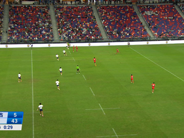 香港男子七人欖球隊,在十五運會小組賽第2天,43:5擊敗內蒙古,3戰全勝、小組首名晉級四強,今晚與江蘇隊爭入決賽。小組賽擊敗山東隊及天津隊之後,港隊今日陣容有所調整,李卡度未入比賽名單,丹馬克退居後備,芮飛及房傑鋒首次正選上陣。開賽後54秒,房傑鋒已達陣取得5分,港隊在上半場達陣3次,射入1個附加罰球,半場領先內蒙古17:5。到下半場,港隊4度達陣得分,其中兩次來自後備上陣的丹馬克,港隊另射入3個附加罰球,合共增添26分,而內蒙古下半場未有得分,港隊最終全場以38分距離取勝。