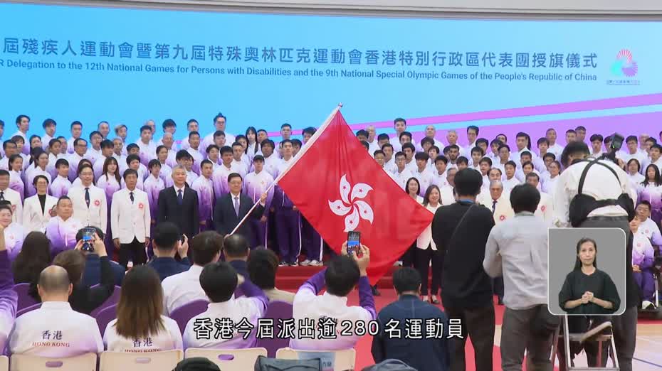 【有線新聞】全國殘特奧會下月舉行,香港代表團舉行授旗儀式。\n特首李家超將區旗授予身兼代表團團長的文體旅局局長羅淑佩。香港今屆派出逾280名運動員,出戰殘運會14個競賽項目、4個大眾項目以及特奧會7個項目。連同約140名隨團人員,代表團規模是歷來最大。今屆殘特奧會由粵港澳合舉,下月8日至15日舉行,當中硬地滾球、輪椅劍擊及乒乓球等四個競賽項目由香港承辦。