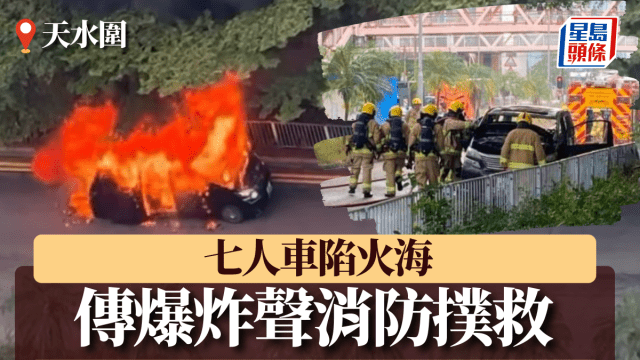天水圍有車輛起火。今日(24日)早上8時28分,一輛七人車駛至天秀路與天影路交界時突然起火,火勢一發不可收拾,傳出爆炸聲並冒出大量濃煙。司機連忙下車逃生,消防到場出動一條喉及一隊煙帽隊撲救,約10分鐘後將火救熄。事件中無人受傷,起火原因有待調查。七人車陷入火海。fb車cam L(香港群組)影片截圖七人車起火焚燒,並傳出爆炸聲。fb車cam L(香港群組)影片截圖fb車cam L(香港群組)影片截圖消防員到場將火救熄。fb馬路的事 (即時交通資訊台)圖片