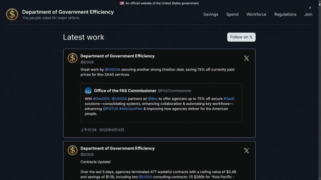 美國政府首次證實政府效率部已經解散。美國總統特朗普上任後,為削減政府規模而設立的政府效率部,雖然任期還剩八個月,但已經解散。美國人事管理局局長庫柏被問及政府效率部的現況時,表示根本不存在。這個由富商馬斯克掌管的部門在今年1月成立後,馬斯克對政府進行大刀闊斧改革,縮減聯邦機構的規模、削減其預算,或將工作重心轉移到特朗普的優先事項上。根據特朗普簽署的行政命令,政府效率部應運作至2026年7月。