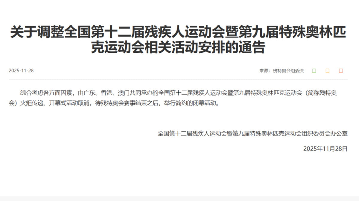 因應大埔宏福苑5級火,原定明日在香港、澳門、廣州及深圳4個城市,同步舉行的殘特奧會火炬傳遞,宣布取消。殘特奧會組織委員會辦公室發布通告,指綜合考慮各方面因素,火炬傳遞及下月8日在廣州舉行開幕式活動取消。會等賽事結束後,舉行簡約的閉幕活動。特區政府發言人表示,由於火炬傳遞活動香港站取消,早前公布的道路管制和公共運輸安排同告取消。