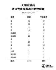愛護動物協會於facebook表示,火警至今仍有84隻動物下落未明。愛協引述警方災難遇害者辨認組(DVIU)表示,拯救隊伍已多次徹底搜索受影響單位,並已尋回所有能被辨識的動物,保證所有肉眼可見的動物籠已全部取出,但由於火勢猛烈,部分動物已無法辨識。 愛協指,由於環境仍危險,目前愛協督察及寵物主人均未能進入大廈。愛協已向漁護署請求提供進一步協助,並建議(1)於建築物內所有可行位置設置人道捕貓籠,定期巡查;(2)在現場及建築物內合適地點放置食物及水源,以支援仍有機會存活的動物;(3)若在收集的灰燼中懷疑發現動物遺骸,立即通知愛協。愛協指,在持續呼籲下,災難遇難者身份鑑定組(DVIU)於昨日(4日)再次展開搜索行動,成功尋獲共152隻動物,其中72隻幸存,80隻不幸罹難。在72隻幸存動物中,包括2隻貓、65條魚、1隻守宮及4隻龜。愛協對所有參與人員表達最誠摯的謝意。愛協已即時為所有獲救動物進行健康檢查,並已聯絡其飼主。愛協承諾,如收到政府部門或其他機構的任何進一步消息,將第一時間通知受影響的寵物飼主。愛協呼籲受事件影響的寵物主人、需要獸醫診治、基本寵物用品、臨時寄養或情緒支援的人士,可隨時致電27111000或22325553聯絡。相關字詞﹕大埔宏福苑五級火