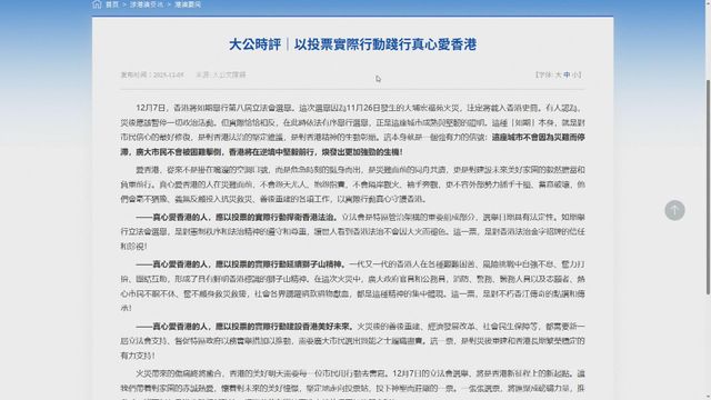 明日是立法會選舉投票日,港澳辦轉載評論,呼籲市民投票,以行動踐行愛香港。港澳辦轉載《大公報》評論,指災後依法有序舉行選舉,是對市民信心的最好修復,亦是一個強而有力的信號,說明這座城市不會因為災難而停滯,廣大市民不會被困難擊倒,香港將在逆境中堅毅前行。評論指,真心愛香港的人,應以投票的實際行動,捍衛香港法治,讓世人看到香港法治,不會因大火而褪色。又指火災善後重建、經濟發展改革、社會民生保障等,都需要新一屆立法會支持,督促特區政府以務實舉措加以推動,需要廣大市民選出賢能之士履職盡責。