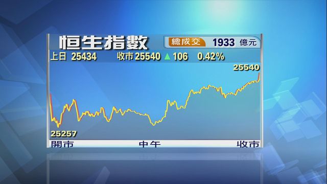港股先跌後升,以全日高位收市,但成交縮減。連跌了兩日,大市有反彈。恒指最多下跌176點,曾經跌穿25,300點關口。午市逐步回穩,收市倒升106點,報25,540點,成交1,933億元。胤源世創家族辦公室(香港)第一副總裁黃偉豪稱:「特別是100天線近日失守後,暫時未能再企穩之上,未來要看這位置能否收復,再看年底前能否試26,200點以上水平。一旦真的無法收復100天線,短線向下支持位,要看過去兩個月低位,約25,100點位置。」港交所先跌後回穩,曾經失守400元,見五個月低位。領展下跌百分之1,見半年低位。運費指數下跌,航運股有沽壓,東方海外是表現最差的藍籌。國際油價下跌,中石油和中石化跌百分之1。憧憬美國減息,金礦股有支持,靈寶黃金升百分之9。據報萬科與債權人商討債務延期,股價升一成三。擬配股集資的長飛光纖先跌後升,收市升一成。