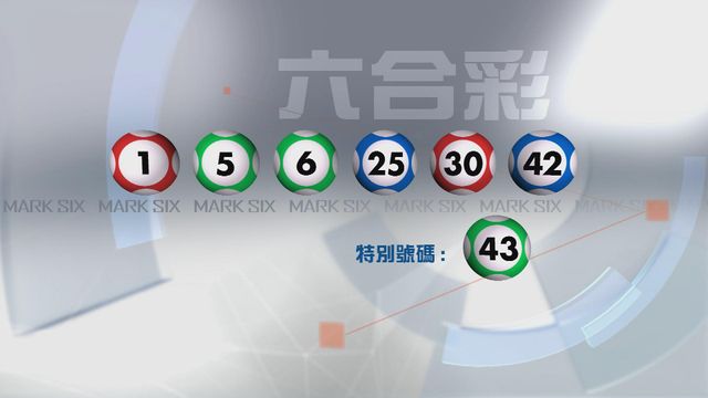 六合彩號碼:1、5、6、25、30、42,特別號碼:43。頭獎一注中,派八千二百幾萬。