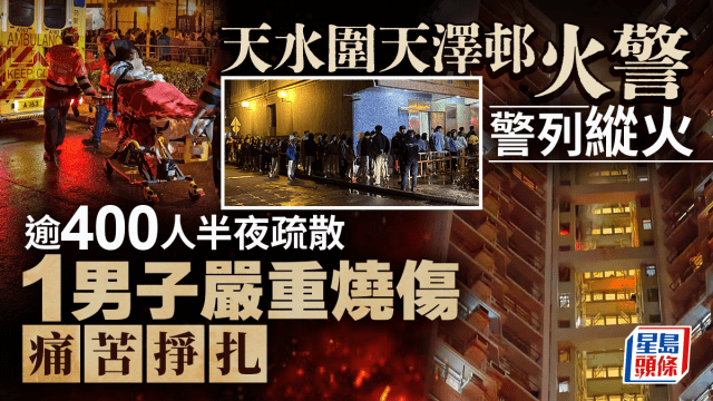 天水圍今晨(13日)發生火警。天澤邨澤潤樓一個高層單位凌晨時份突然冒煙起火,火勢迅速蔓延,陷入火海。消防接報到場開喉撲救,救出一名51歲男子,他身體多處被嚴重燒傷,昏迷送院治理。事件中,至少有400名住戶被緊急疏散。消防調查後認為火警原因有可疑,列緃火案跟進調查。男傷者身體多處燒傷 不斷痛苦掙扎事發於今日凌晨3時43分,警方接獲多人報案,指天澤邨澤潤樓有單位冒出濃煙並起火。消防員到場後破門入屋,在起火單位內發現了姓謝(51歲)男住客,當時他仍然清醒,其上半身約有20%燒傷,消防員立即將他救出,將謝男送往屯門醫院,惟他到達醫院後昏迷。事件中共有約400居民疏散,消息指消防員將火救熄後,發現在單位內有兩處起火點,分別在廚房及廁所,認為起火原因有疑,案件交由元朗警區刑事調查隊第12隊跟進。根據網上圖片及影片,該高層單位當時已陷入一片火海,現場濃煙密佈,警鐘持續鳴響。消防員救出一名男傷者,救護員隨即在該樓層升降機前方位置,為傷者提供初步治理。51歲姓謝男傷者為起火單位戶主,他身體多處地方燒傷,疑因傷勢嚴重一度不斷痛苦掙扎。他隨後被救護車送往屯門醫院接受治理。火勢於同日凌晨4時11分被消防人員撲滅。在火警發生期間,多名住戶從睡夢中驚醒,前往樓下暫避,事件中有400人緊急疏散至樓下空地暫避,有人仍身穿睡衣褲,亦有帶同寵物逃生。