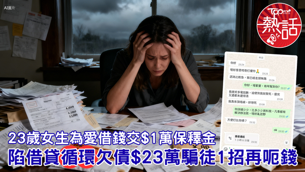 借貸須謹慎!近日,有財務公司在Threads發帖分享案例,指1名23歲的女生向其求助,為給男友交1萬元保釋金,在網上申請貸款,墮入連環借貸騙局,債務滾雪球般累積逾23萬元,令她無力償還而瀕臨崩潰……轉數快騙局|轉數快突收10萬轉賬傳短訊稱轉錯 網民懷疑騙徒做局呃錢:擺明騙案借貸陷阱|為犯事男友網絡借貸交保釋金樓主以「後生女跌入財務電話數騙局」為題發帖,指事主是甜品學徒,月薪1.6萬元,從未借貸,甚至沒有信用卡,但上個月為給犯事男友繳交1萬元保釋金,輕信網上借貸廣告,向「借貸公司」借了2萬元;如今時隔僅不到半個月,對方便要求她即時還清所有欠款,否則將面臨高昂罰款。 ▲ 女生墮連環貸款陷阱,瀕臨崩潰。(AI圖片)借貸陷阱|陷借貸循環騙局被呃錢正在她方寸大亂時收到一條訊息,表示能夠「即時過數」借事主3萬元,實際到手2.1萬元;雙方商量借款分3個月還清,每月1.2萬元,惟後來竟變成每星期還1.2萬元。事主無奈向同事和朋友借錢,勉強「還清」。然而就在事主第三期還款後,對方表示「(此前還款)只係利息,想清數需要一筆過還6萬,有要求即日入數,如果過氣就罰多3萬」事主聞言又像之前的借貸公司借了8萬元,實際到手6.4萬元。事主將6萬元存入電話數戶後,對方竟以「入數紙無寫名,對唔到數」為由要求她再次轉賬,而後更用各種理由逼迫她交錢令她走投無路,甚至介紹她去「假結婚」賺錢;從最初為繳交1萬元保釋金到現時共計損失逾23萬元,事主的心態也幾近崩潰,直言「好想死」、「走投無路」。 ▲ 女生墮連環貸款陷阱,瀕臨崩潰。(取自Threads)借貸陷阱|網民指男友無擔當帖文引來網民熱議,直指事主男友不作為,「男朋友保釋都係搵家人保,點會由一個冇錢嘅女朋友保,保完個男又要冇幫手還錢,條女都蠢得犀利吓」、「好驚」。