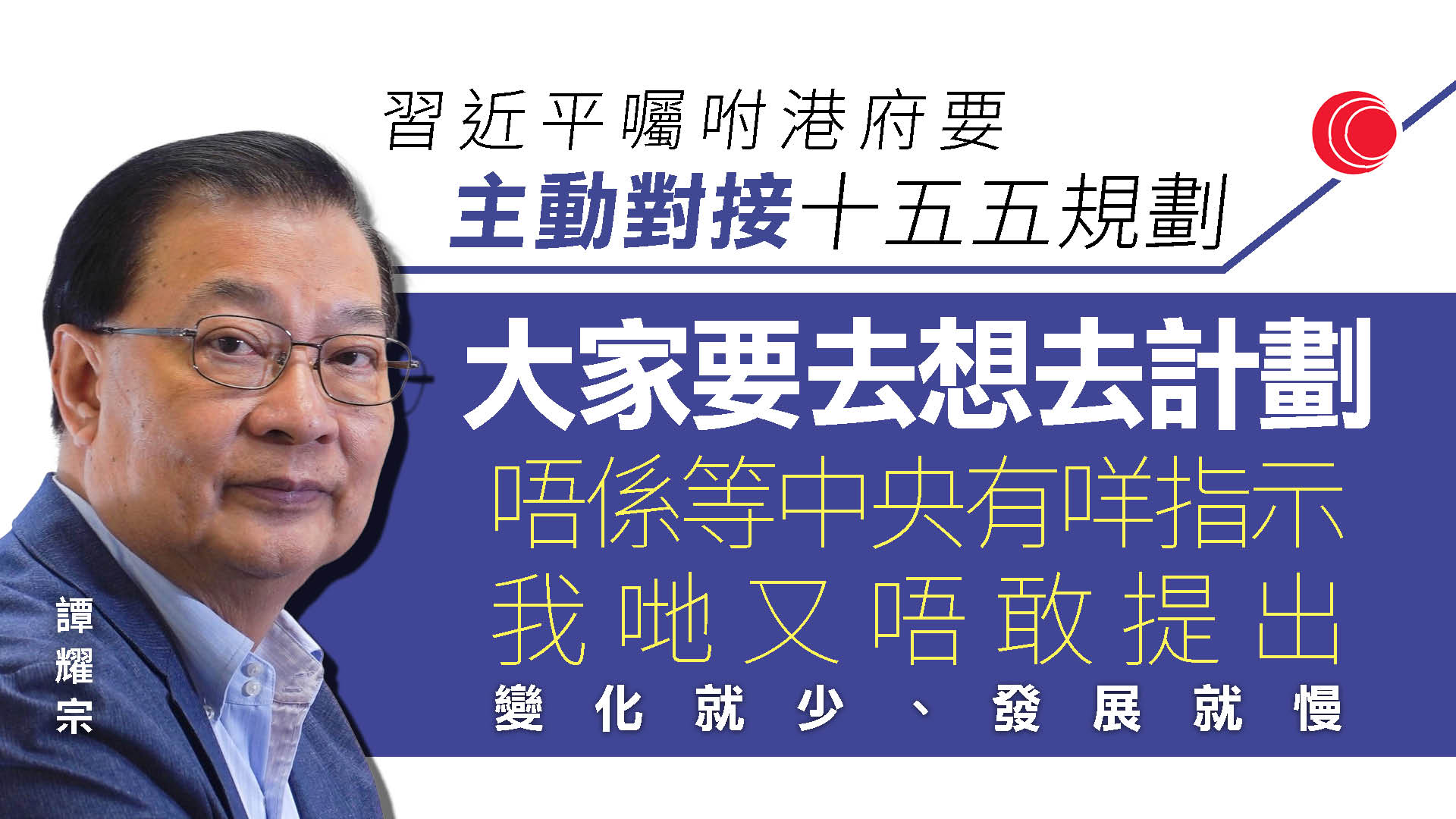 【有線新聞】行政長官李家超述職後,提出特區政府要主動對接「十五五」規劃。全國港澳研究會副會長譚耀宗指重點在於主動積極,而今次沒有提及「全力支持」,相信只是希望突出其他重點。
