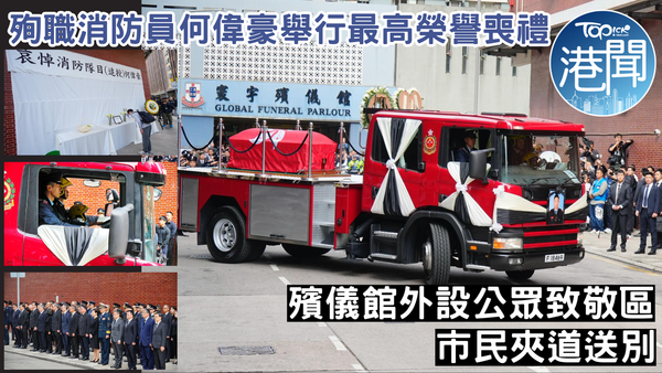 【何偉豪 / 消防處 / 宏福苑】大埔宏福苑五級火,37歲消防員何偉豪殉職。消防處在今日(19日)在紅磡世界殯儀館為殉職消防隊目(追授)何偉豪舉行最高榮譽喪禮,殯儀館外設置公眾悼念區。喪禮官方儀式今早10時開始,政府官員、社會賢達和消防處屬員參與,儀式不會對公眾開放。早上約9時半,保安局局長鄧炳強、消防處署長楊恩健、警務處長周一鳴到靈堂致哀,多個紀律部門人員亦先後抵達靈堂,包括警務處及海關。約9時50分,行政長官李家超、政務司司長陳國基亦乘車抵達。大埔宏福苑五級火|殉職消防員何偉豪女友悲痛發文:好想好想可以再拖住你隻手 ▼點擊圖片放大
