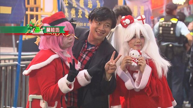 平安夜,中環皇后像廣場有20米高的聖誕樹,配上「光影匯」「坐陣」。蘭桂坊晚上都人頭湧湧,有酒吧就擔心受外遊影響,推出免費飲品吸客。中環的冬日小鎮,賣點之一是終審法院等八幢地標建築物,透過投影換上聖誕裝束,不過焦點仍然離不開這棵20米高的聖誕樹。派禮物前,他留在冬日小鎮與市民合照,小鎮人頭湧湧,不少都是一家大小。朱太稱:「小朋友第一次帶他們來、感受一下,也是食聖誕大餐、和他們看燈飾。」另一名朱太說:「他剛剛一歲,第一年聖誕節一起過,所以便為他戴個頭飾。」一般人聖誕節戴聖誕帽,但她就將聖誕老人的褲倒轉戴上頭。曾小姐表示:「因為這樣很襯聖誕節,把歡樂帶給大家及自己、很開心。」有內地留學生第一年在港過聖誕,特地叫父親來港一齊感受氣氛。內地留學生王小姐稱:「香港聖誕氣氛較濃厚,內地沒那麼多活動。」數條街之隔的蘭桂坊,越夜越多人,小朋友都來見「世面」。鍾太指出:「未帶他們來過,這裡聖誕、平安夜熱鬧些。」記者說:「這邊很多酒吧不適合小朋友。」鍾太回應:「我們不入去不要緊。」有旅客稱有一個聖誕願望。美國旅客Mark稱:「減40磅,我會去吃自助餐,甚麼都吃,所以減磅都是聖誕後才算。」有酒吧負責人指,因應不少市民外遊,生意額或較去年跌近三成,要想盡辦法吸客。酒吧負責人Adrian指出:「我們靠社交平台宣傳,派免費飲品吸引客人來,盡量裝飾得漂亮一些。每台都有眼鏡或頭飾給客人佩戴,外面也有棵聖誕樹,都會布置些聖誕氣氛。」蘭桂坊的路牌亦成為打卡點,包括這個有聖誕花圈及裝飾,就吸引不少市民及旅客。