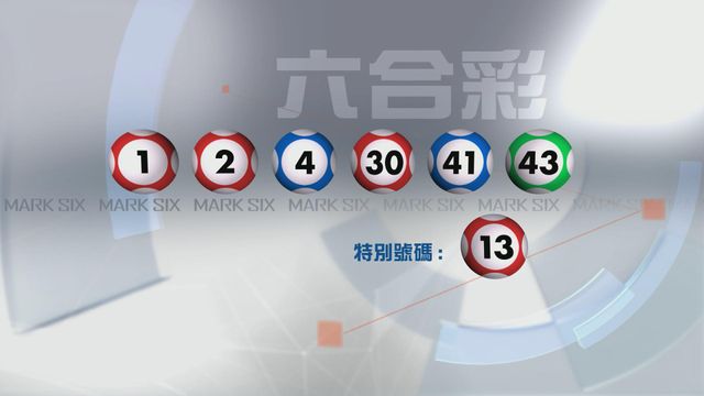 六合彩號碼:1、2、4、30、41、43,特別號碼:13。頭獎無人中,二獎半注中,每注派逾280萬。