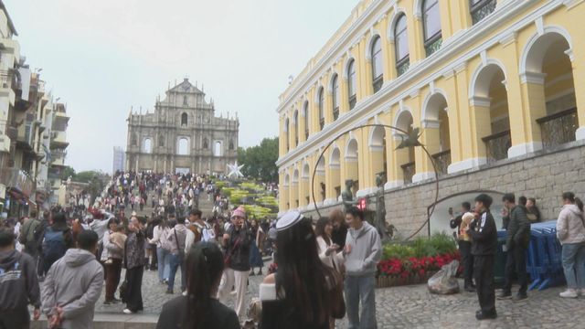 在澳門,吸引了不少遊客趁聖誕假期到訪,但有商舖表示,今個假期的生意較往年遜色。「拆禮物日」,澳門雖然不是公眾假期,地標大三巴仍然非常熱鬧,樓梯上人頭湧湧,迫滿來自世界各地的遊客來影相「打卡」。香港遊客王小姐表示:「氣氛濃郁很多,也很有氛圍,大家都開心。有教堂開放,之前沒開的,現在也有。」內地旅客羅先生說:「我覺得澳門挺划算的,作為遊客過來玩,不管是吃東西,還是性價比。大概1,500元,不到2,000元。」在大堂前廣場,亦有不少遊客在馬槽雕像前影相。有外國遊客認為,澳門過聖誕的宗教氣氛比較濃厚。意大利遊客Simone稱:「作為歐洲人和天主教徒,有一種感覺,是這裡的聖誕氣氛比香港更濃厚,香港的聖誕節更商業化,這裡的聖誕感覺不一樣。」在議事亭前地,有不少人同燈飾影相,手信店內亦都迫滿遊客。手信店員工陳小姐指出:「23至24日之後就多很多人,都是香港客、內地客多,基本生意額比平時好很多,上升了少少,但比往年肯定是沒那麼旺,(比平日多)大概一兩成左右。」檔販周先生表示:「燈飾亮燈時間提早,比較好,亮燈後街道沒那麼黑,有燈飾就有人拍照,遊客都會逗留長點,才會留意到我們。」去到傍晚時分,聖誕燈飾亮燈後,令廣場的景色更加璀璨。澳門政府在90個地點布置聖誕燈飾,超過一半是在澳門半島區,展出直至明年一月。