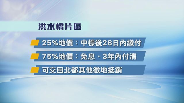 北部都會區首個片區明日起招標,涉及洪水橋11公頃用地,政府增加住宅地數目,亦容許中標發展商可分期付地價,對市場反應樂觀。當局又會成立產業園公司,管理洪水橋另外23公頃土地。發展局局長甯漢豪下午交代洪水橋片區的招標細節。總面積達11公頃,包括三幅住宅地,和三幅企業及科技園用地,合共提供3,120個住宅單位,及28萬平方米產業樓面面積。招標期達半年,以雙信封制進行,非價格建議比重佔七成。投標者須發展及營運,至少一幅企業用地,若願意營運更多,可獲加分。地價支付採分期方式,中標後需在28日內,繳付至少兩成半地價,其餘可免息、三年內付清。亦容許交回其他,政府徵收的北都土地,用來抵銷要付的地價。發展局局長甯漢豪說:「是拆牆鬆綁措施,可減低企業開發土地,面對的現金流壓力。」當局強調,今次招標條款已按市場反映調整,包括住宅地增至三幅,對投標反應樂觀。測量師行董事總經理張翹楚稱:「都算吸引,因為過往政府其實很少讓發展商分期付款。北都目前看來樓面地價不算會很貴,雖然要做一些產業用地,但始終可用更低成本進入北都,是一個吸引力。」發展局同時按《施政報告》要求,就北都用地成立首間園區公司。「洪水橋產業園有限公司」屬非法定,由財政司司長法團全資擁有,負責營運及發展洪水橋另外約23公頃產業園用地。局方明年首季提請行政長官會同行政會議,免地價批出,為期50年。用地由本身用作「港口後勤、貯物及工場」,擴展至先進建造、會展設施、後勤檢測認證等。當中八公頃是「熟地」,餘下15公頃,大部分2027年年底由政府完成平整。政府未來或會向公司注入更多土地,正研究以南的約36公頃物流地。公司除了自行發展土地,亦可招標或批出部分用地,予企業興建產業設施。至於起始注資金額,將會在明年《財政預算案》公布。甯漢豪表示:「至於是一筆過抑或分期,也是屆時才有決定,起始資金其中很大部分,就是在已是熟地的地方進行興建的資金,一定是希望他能做到自給自足,既然他有這個資本,他有土地,考慮在市場借貸也是財政來源。」當局爭取明年1月啟動公開招聘行政總裁,目標公司明年中投入運作。