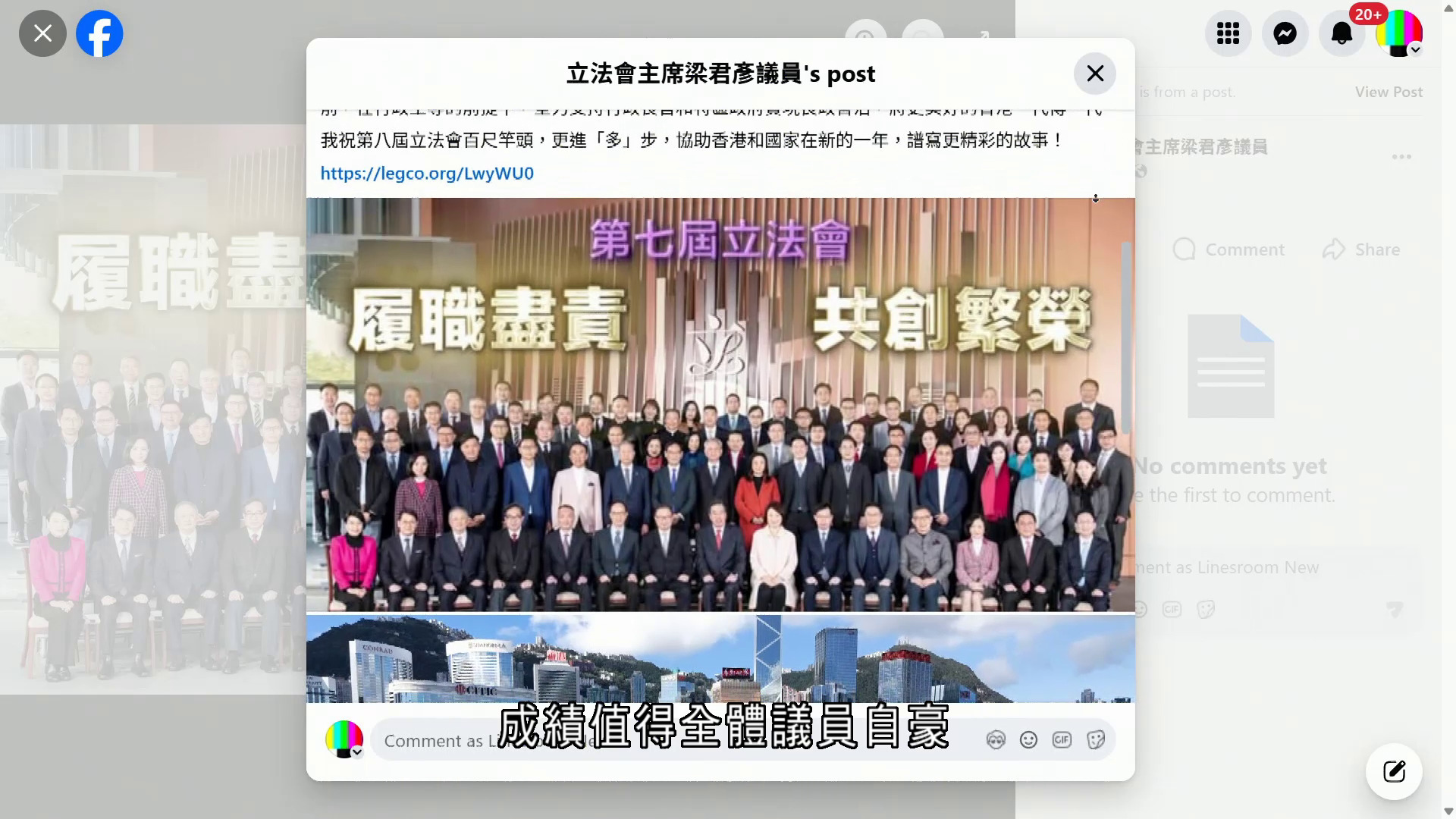 梁君彥在社交網站發文指,今屆立法會履職盡責,竭盡所能「開山劈石」,協助中央和特區政府完成多項推動一國兩制行穩致遠、促進香港繁榮穩定的工作,成績值得今屆全體議員自豪,感謝他們的付出。