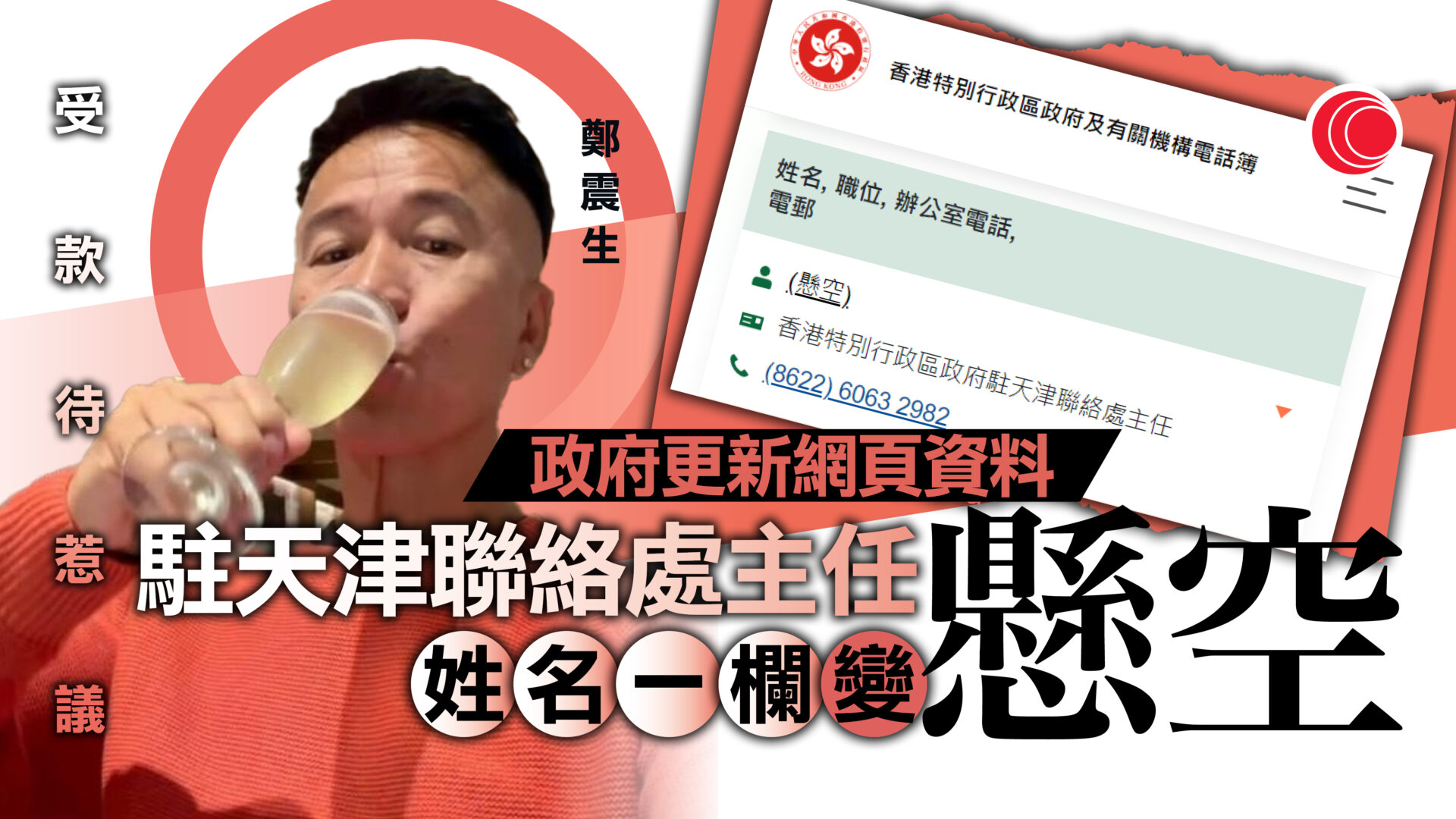 駐天津主任鄭震生自爆獲款待 政府網站職位欄變「懸空」 政制局暫未回應
