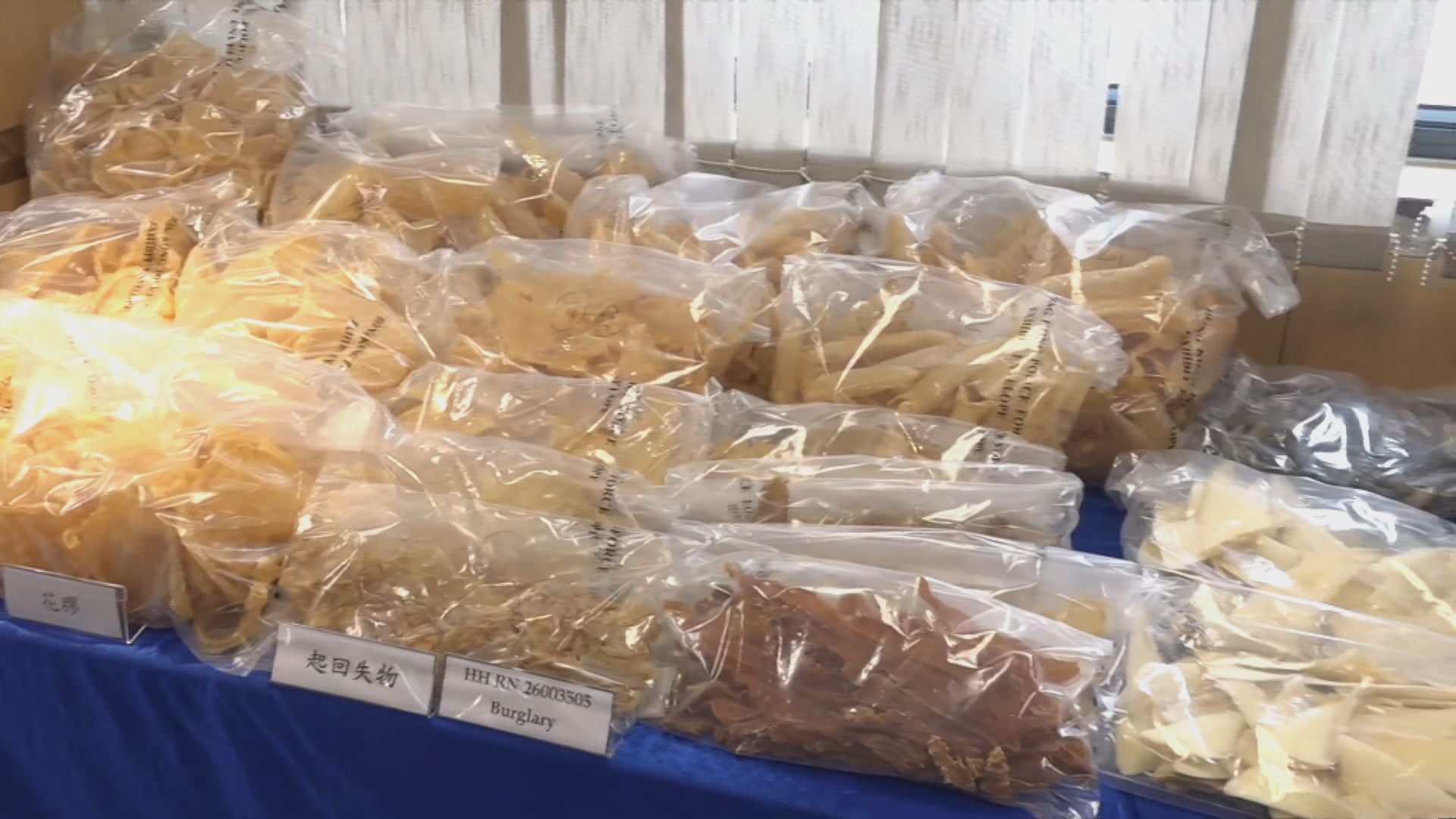 【Now新聞台】土瓜灣一間海味舖遭爆竊,損失約70萬元海味,警方拘捕3人。 行動中起回部分海味,包括花膠、遼參及魚翅等。警方周一接獲一間土瓜灣海味舖報案,指店舖被搜掠,損失約70萬元海味和3000元現金。警方翻查閉路電視後鎖定三名男疑犯,分別於周二及周四以入屋犯法罪拘捕他們,三人報稱無業,其中66歲疑犯相信是主謀,他同時與二月荃灣一宗企圖爆竊案有關。