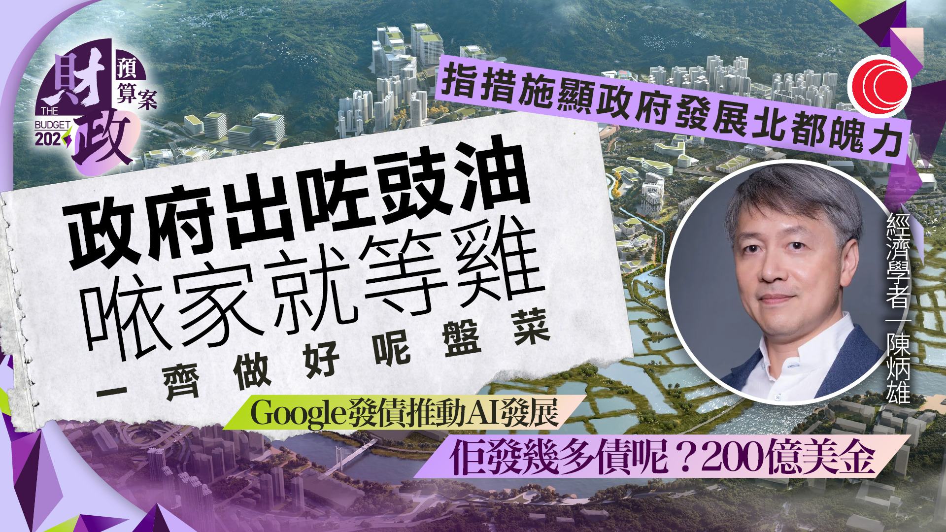 【有線新聞】財政預算案從外匯基金轉撥1,500億到工程儲備,亦向北都三間園區公司注資100億元,有經濟學者認為措施顯示了政府銳意發展的魄力,北都諮委會成員劉國勳說園區公司要訂立績效指標,確保公帑運用得宜。\n預算案向北都三間園區公司各注資100億元,有經濟學者在本台節目《政經Chat》指,今次政府投入對比私人市場募資力度已相對少。港大經管學院創新與創業研究中心副總監陳炳雄:「政府出了『豉油』,現在就等『雞』一起做好這盤菜。美國Google發債推動AI發展發多少債呢?200億美金,如果我們看這個數字,對比香港政府的100億元,這100億元我一直說是牽頭模式。但當政府顯示這個魄力時,自然其他機構就會想一起合作,一起把整件事做好。」\n北都諮詢委員會委員劉國勳認為政府應確保資金用得其所:「其實三間公司的資產不止100億這麼少,因為將來可以用地跟企業批地合作,或以地換股。我拿了這100億,目標要吸引多少間公司落地園區,創造多少就業機會,未來要創造多少收益等等,起碼當(園區公司)董事局到位時,都要訂好這些績效指標。」\n政府最新修訂預算今個財政年度有29億盈餘,終結赤字,40年多來首次從外匯基金,轉撥1,500億到基本工程儲備基金,陳炳雄及劉國勳都認為政府是想捉緊發展時機。陳炳雄:「上次動用是1984年時,1984年是甚麼時候呢,我們在討論主權交接。現在今年我們見到,國家領導人在說是百年大變,如果我們要經歷百年大變時我們就要這個糧草、資金,推動整件事發展。」劉國勳:「現在香港轉型階段,我們似乎要更主動、更主導,去將錢放在香港推動經濟轉型及發展方面,始終說實話,錢放著也是要用的,關鍵是看是不是用得其所。」\n北都大學城短期內會推出三幅用地,政府提供貸款予資助大學興建校舍,劉國勳建議可以批准一間院校同時投得,否則地皮規模太小會影響發展效益。」