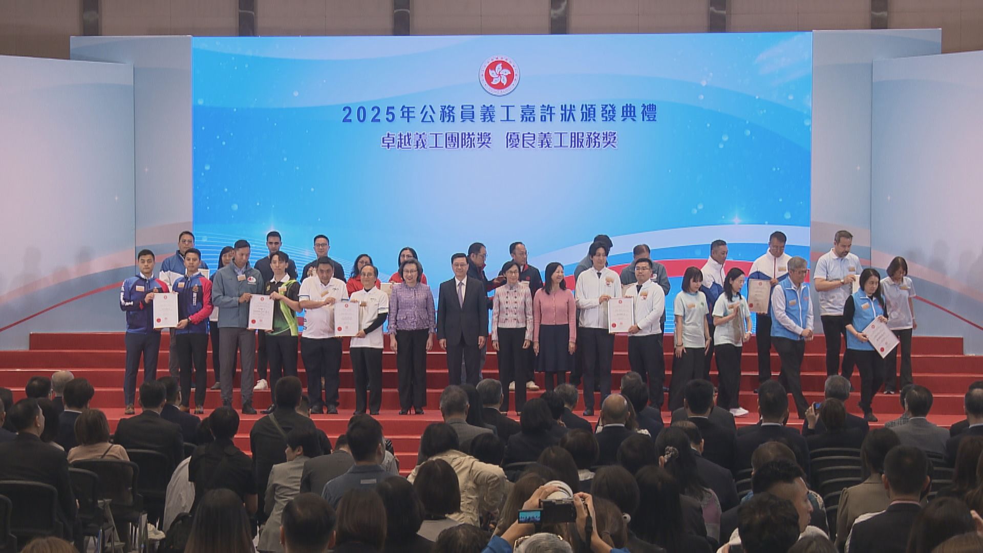 【Now新聞台】公務員事務局表揚至少連續5年工作表現優秀的公務員。 行政長官李家超、公務員事務局局長楊何蓓茵等官員出席頒發嘉許狀儀式。今年有100名公務員獲嘉許,來自39個政策局及部門、55個職系,亦有435名公務員獲義工嘉許狀個人獎項。 被問到政府採購冒牌樽裝水風波會否影響公務員形象,有得獎者表示政府有完善機制處理,他們會做好本份,維持公務員形象。 海關總關員黃志明:「市民對公務員期望愈來愈高,作為公務員,我自己個人工作上的心得,是要細心、可靠及專業,還要與時並進,緊貼社會發展,一定要以人為本,急市民之所急。」 天文台高級科學主任黃偉健:「無論發生甚麼事,都要堅持公務員本身的操守,從市民角度想多一些我們工作上要注意的地方。我認為堅持這個信念,做好我們本份,是我們作為公務員應該要有的態度。」