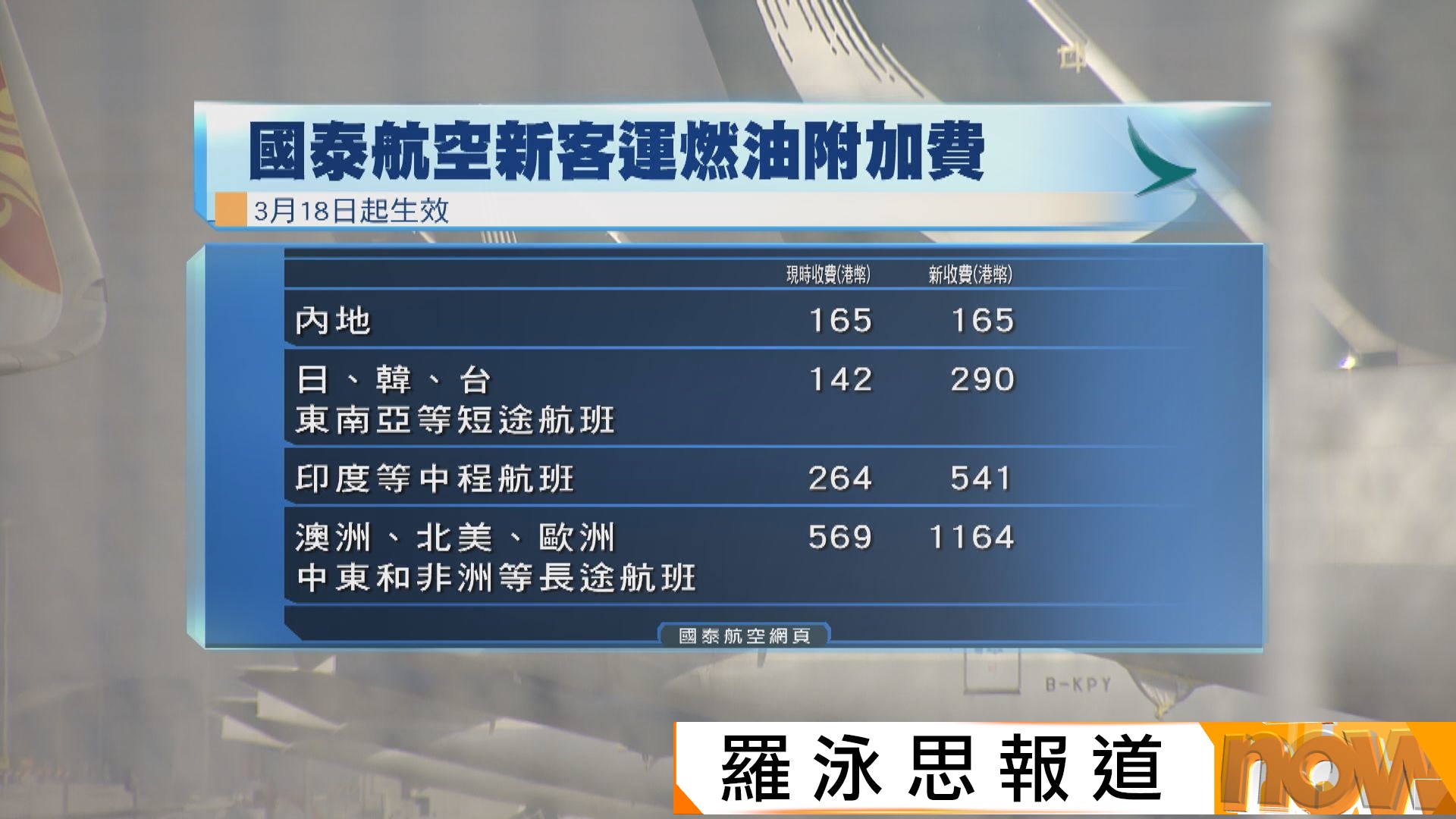 【Now新聞台】國泰航空和香港快運亦宣布本月18日起上調燃油附加費,增幅超過一倍,國泰長途航班的燃油附加費來回加至2328元。有旅行社表示,會盡快為團友辦理機票。 航空燃油價格波動下,再有航空公司調整機票的燃油附加費。國泰航空宣布本月18日起,除了香港往內地航線維持165元,其餘航線的燃油附加費都加逾一倍。 其中往日、韓、台等地的短途航班,將由現時的單程142元,增至290元,中程航班則上調至541元,而往來香港及北美、歐洲和中東等長途航線會由每程569元增至1164元,即來回要多付1190元。 國泰的燃油附加費升幅遠高於香港航空,每程加5至150元,其長途線新收費739元,而日韓及東南亞加至212元。 國泰稱,航空燃油價格自本月以來上漲接近一倍,有需要根據現行既定機制上調,重申會定期檢視燃油附加費水平。 有旅行社稱,公司大部分團都是乘坐國泰來回,當中日本團達九成,歐洲和澳洲團也有七至八成,加上中東局勢不明朗下避免在當地轉機,而國泰提供最多直航航班,難以馬上轉用其他航空公司,會盡快為已有足夠人數的復活節團等出機票。 縱橫遊常務董事袁振寧:「很少加一倍、很少見,通常慢慢加,期油60美元至100美元一桶都未有一倍加幅,突然國泰公布多一倍,所以這比較下就覺得意料之外。若團隊滿了,我們當然會趕這限期在本月18日前出票,就毋須客人多付燃油附加費,但團未必收得滿,例如四月中的團只有一半人報,就很難及不可能局部開票。」 另外,香港快運都在下周三上調附加費,往來內地維持165元,其餘航段則由140元增至290元,加幅亦超過一倍。