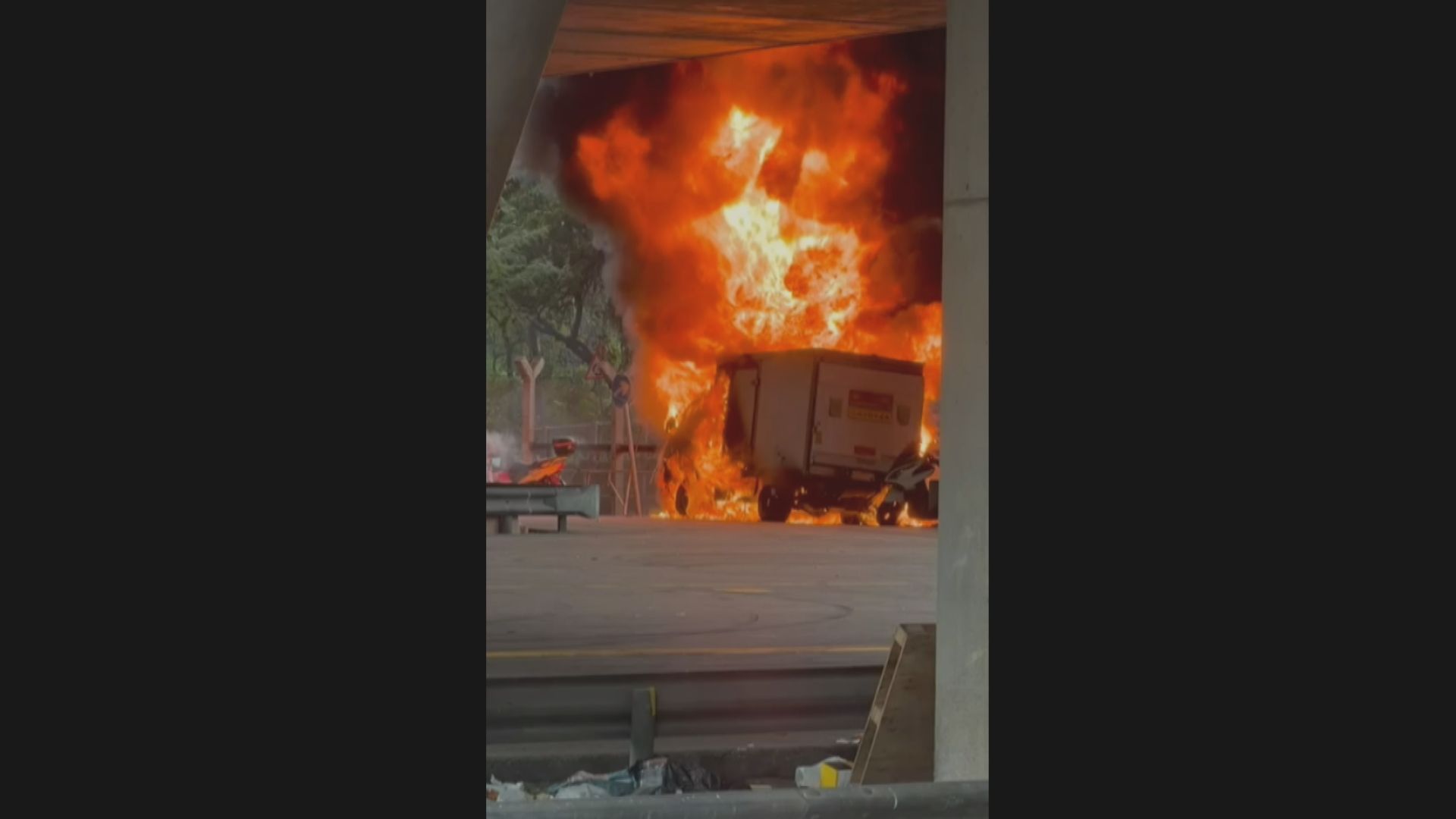 【Now新聞台】葵涌貨櫃碼頭有貨車起火,無人受傷。 起火的貨車陷入火海,冒出大量黑煙升上半空,對上的行車天橋被黑煙籠罩。現場是葵涌四號貨櫃碼頭對開一個露天停車場,下午二時許,一輛停泊在上址的貨車突然起火,火勢波及旁邊兩輛電單車。消防員接報到場,迅速將火救熄,調查後相信火警有可疑,轉交警方跟進。